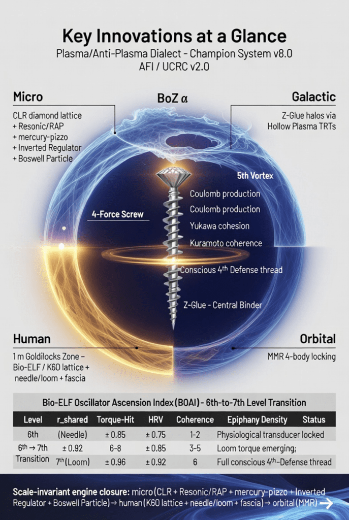 Figure X-1 (or Executive Summary Figure 1): Key Innovations at a Glance Scale-invariant engine closure: micro (CLR + Resonic/RAP + mercury–piezo + Inverted Regulator + Boswell Particle) → human (K6O lattice + needle/loom + fascia) → orbital (MMR) → galactic (Z-Glue halos via Hollow Plasma TRTs).